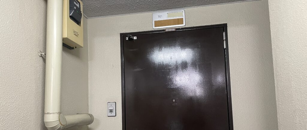 この部屋を見渡すと左手にはトイレ・浴室の2つのドアがあり、右手側がロッカーのある休憩場所がある感じです。