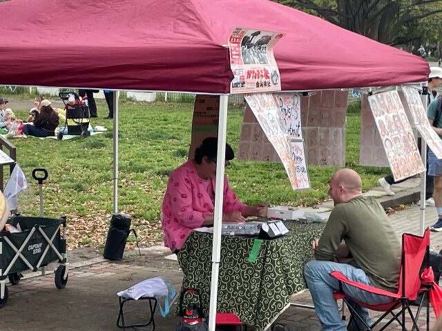 御神木が帰っていくなか、ちょうどこの公園の出入り口のところの前には、とある似顔絵屋さんが!