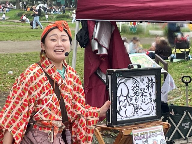 コラボ絵を描いている絵描きの旦那さんも陽気でたまに紙芝居の合間に愛の手を入れたり、紙芝居の途中で目の前を自転車に乗った子供がまさかの通過したりと自由感もハンパない状況でした。