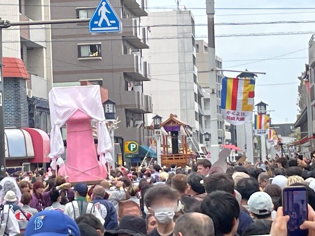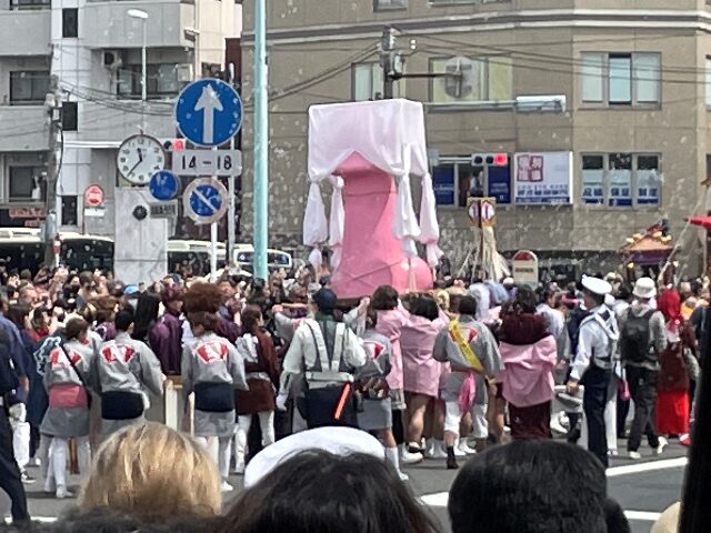 遠くからも男性器を模した巨大なピンクが際立つ神輿であり、かまなら祭りのシンボルでコレをメ見に来られる人も多いでしょう。