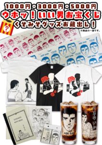 ノートやコーヒーなどの一部グッズは販売していますが、他のアイテムはどうやらくじ引き「ウホッ!いい男お宝くじ」で当てなければならず、一回1000円から5000円でできるようです。